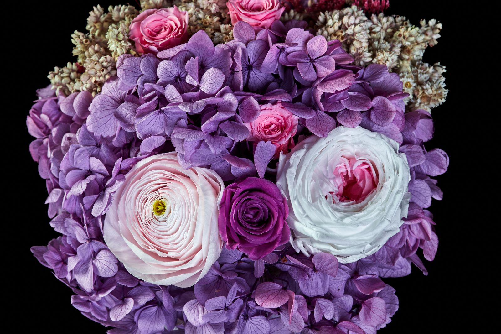 Abrazo Eterno es un diseño floral preservado que envuelve a mamá en un gesto lleno de amor que perdura en el tiempo. La delicadeza de la rosa inglesa, acompañada de rosas, ronanculu, mini rosas y hortensias, crea una composición armoniosa, suave y profundamente significativa.