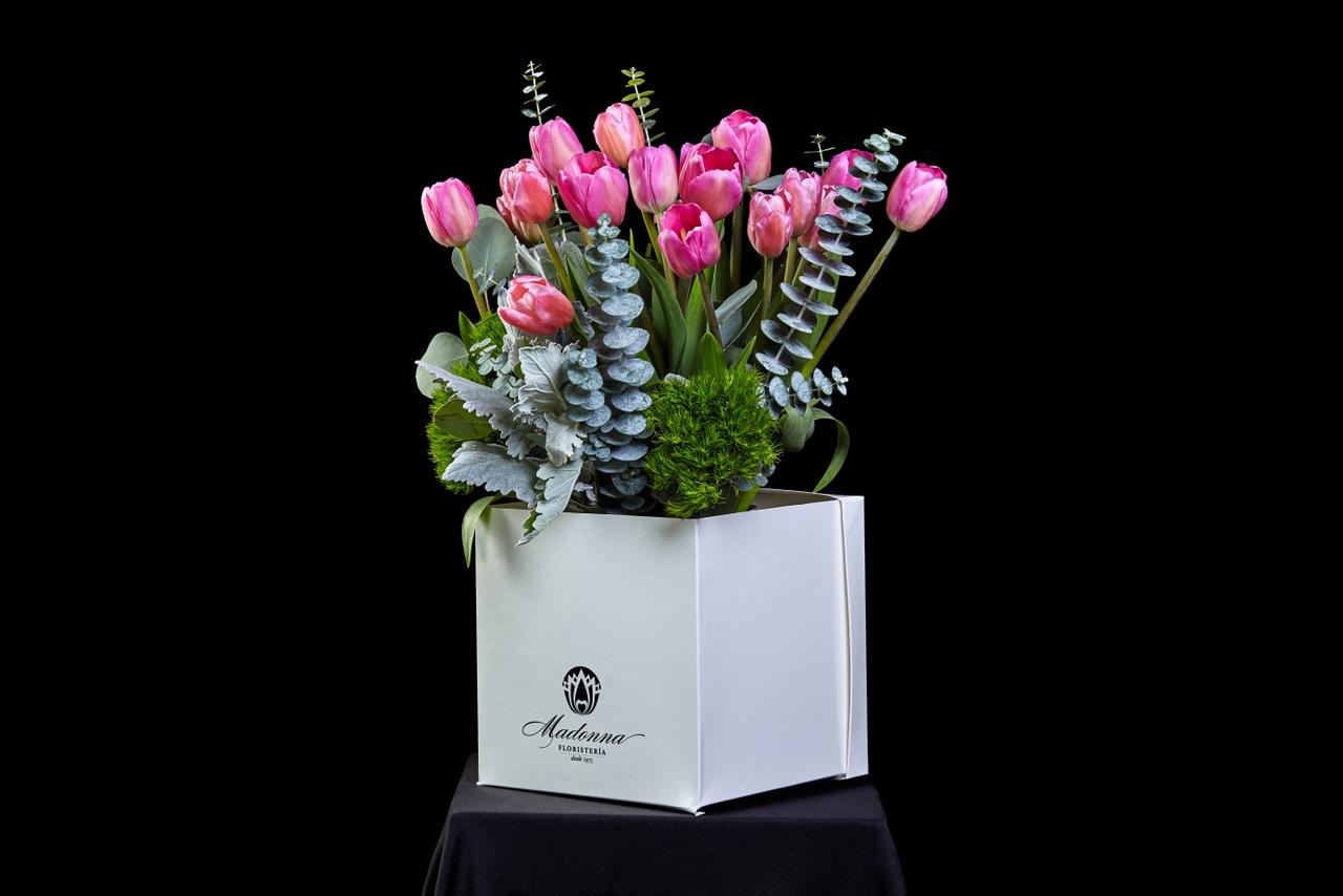 Alegría es un diseño floral natural que transmite luz, frescura y felicidad, inspirado en esos momentos que hacen sonreír a mamá. La delicadeza de los tulipanes, acompañados de follajes especiales, crea una composición armoniosa y llena de vida.