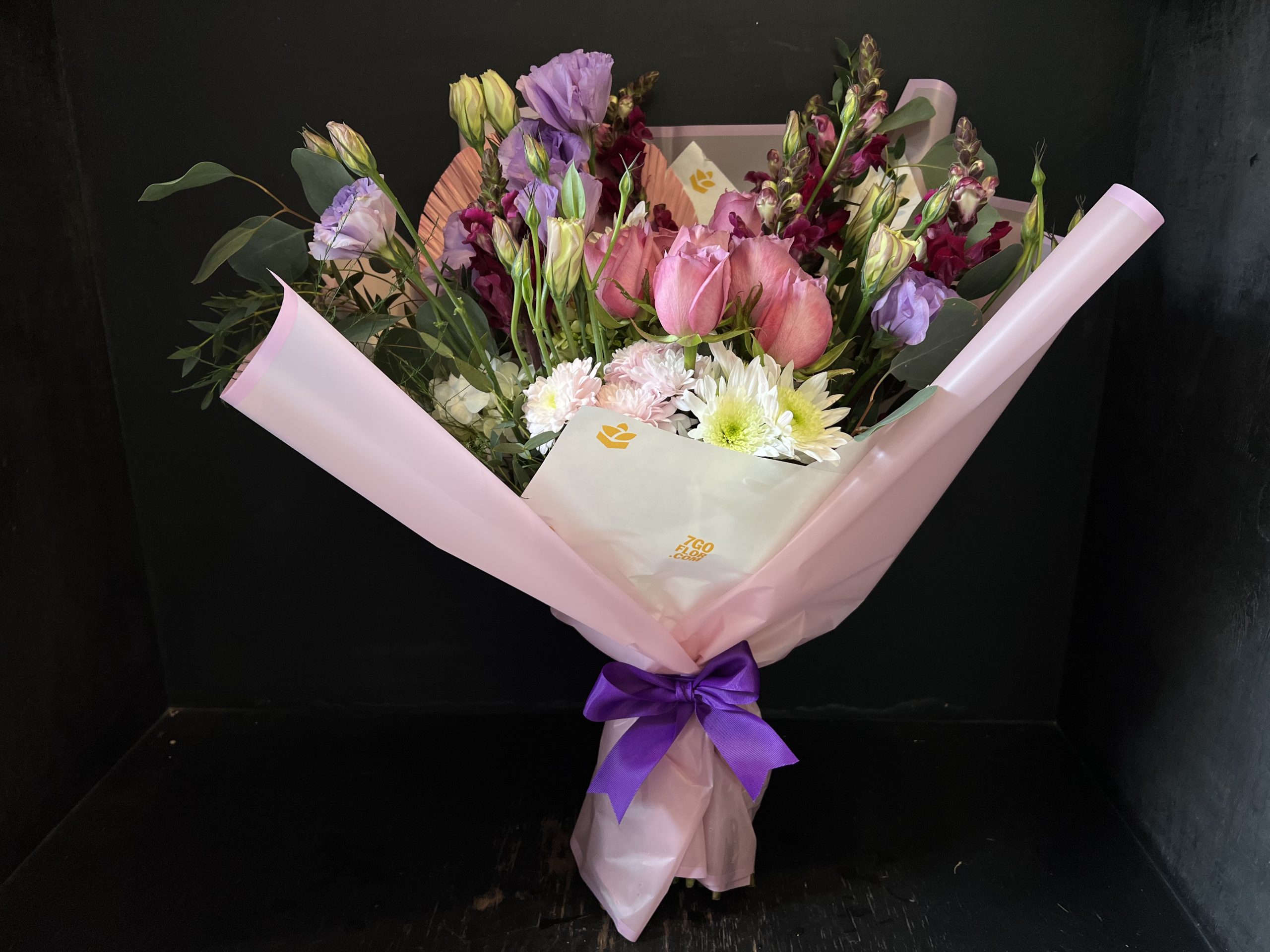 Ramo con rosas, Snap Dragón, Liciantus y flores que complementen la armonía purpura.
