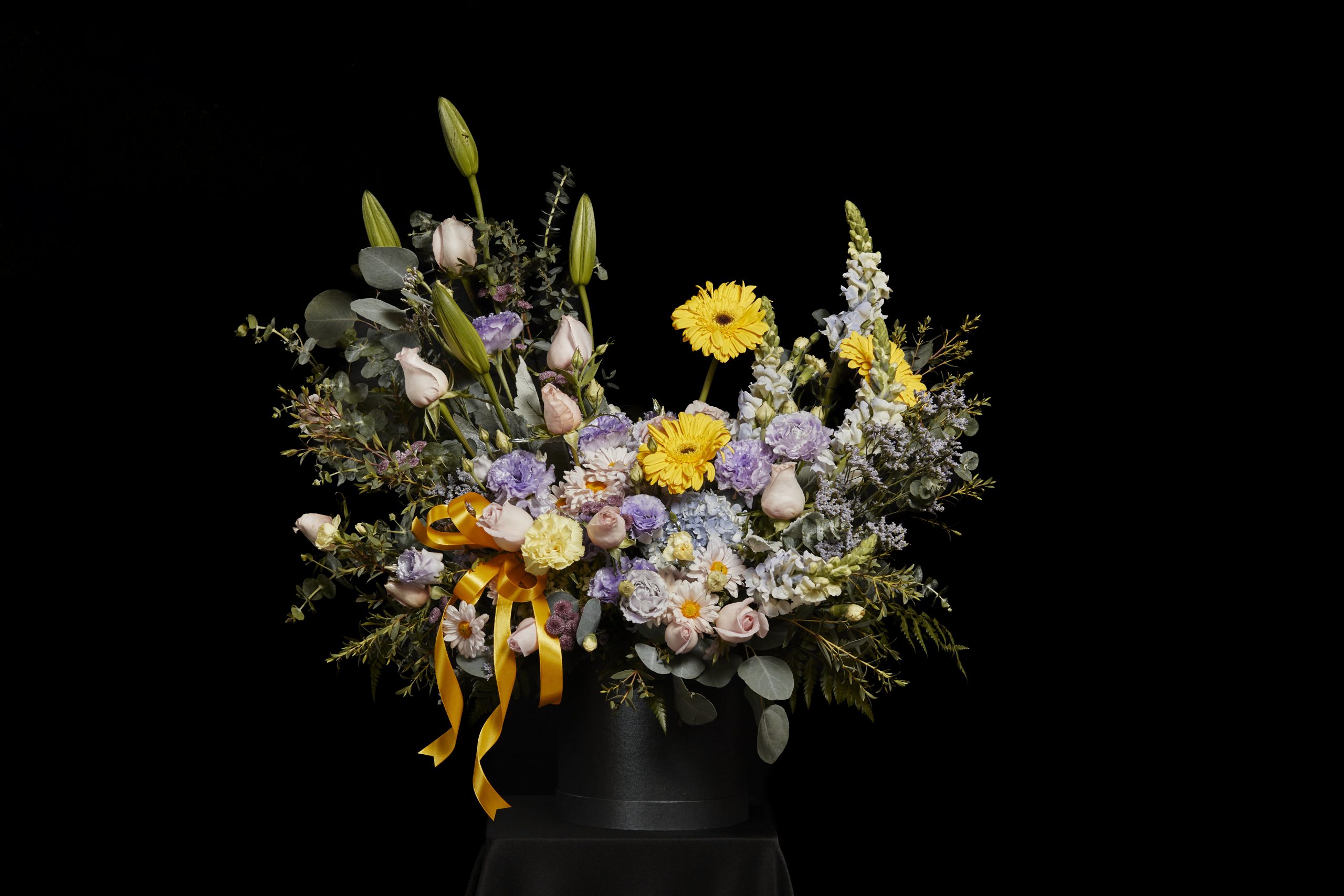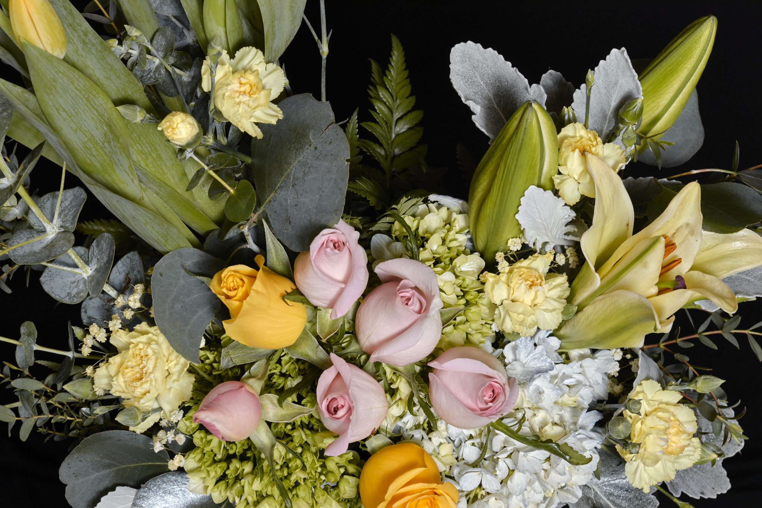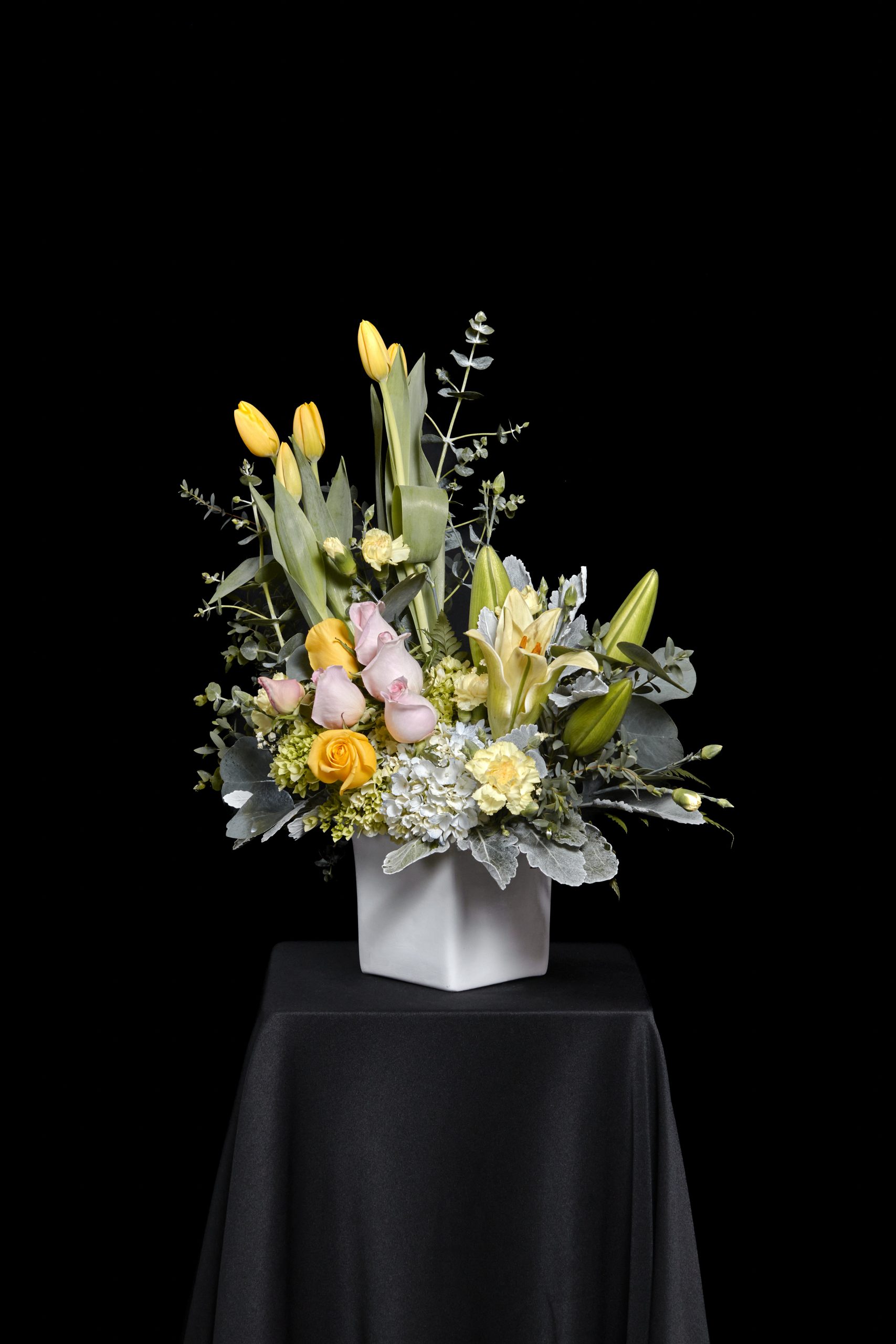 Diseño Floral natural con Tulipanes, LIlis, Rosas, Hortencias y Follajes especiales.