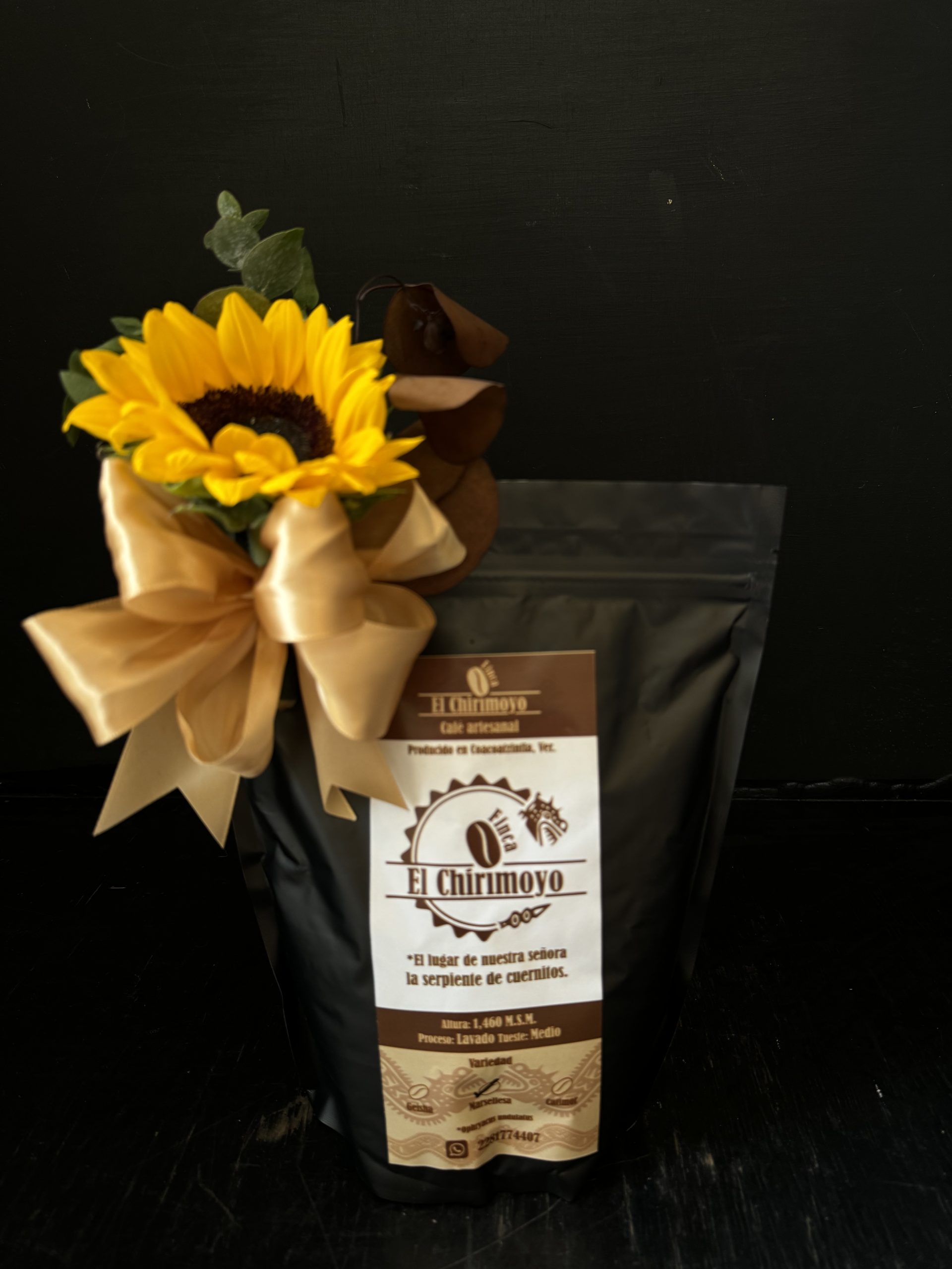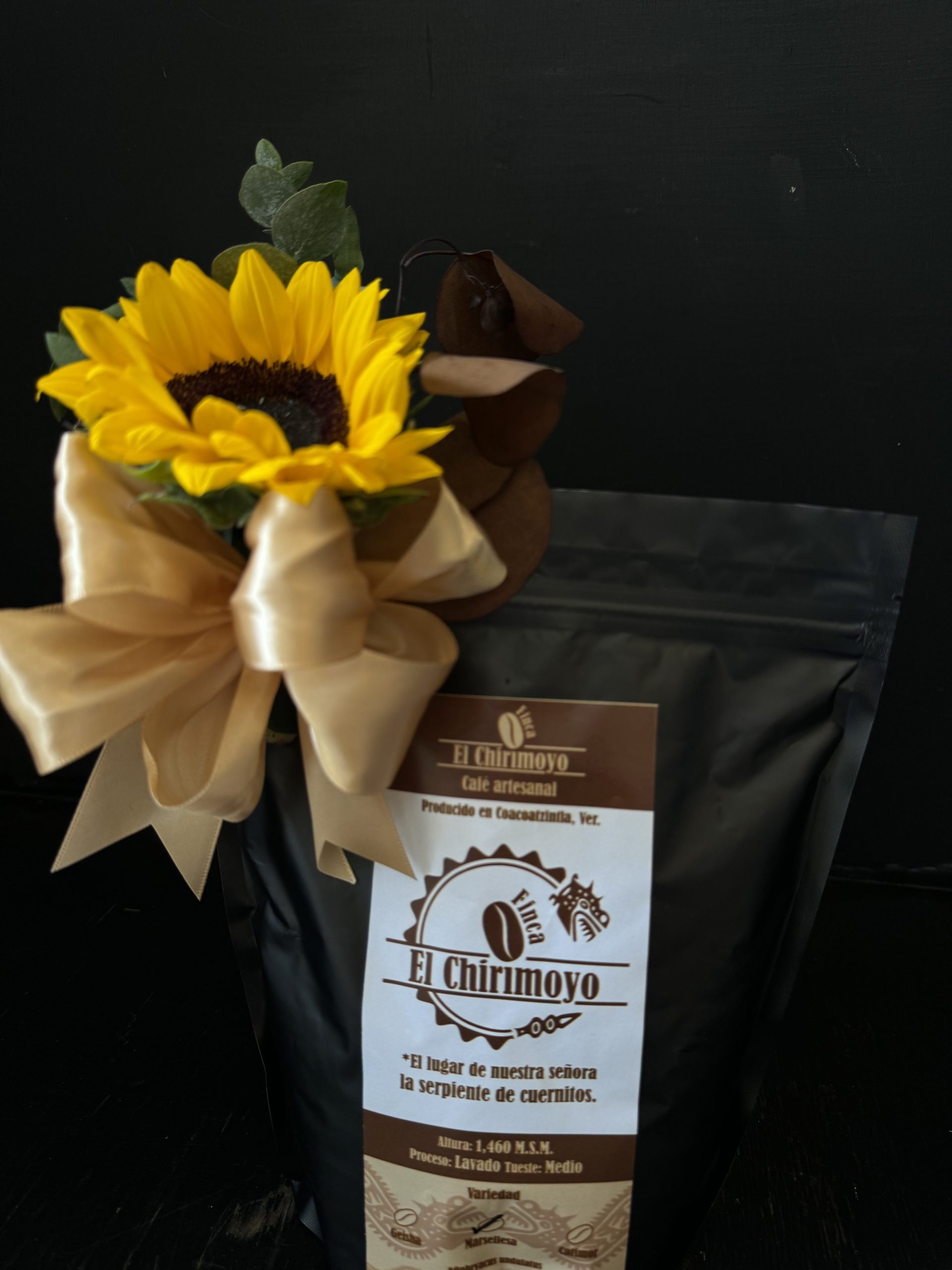 Bolsa de cafe acompañado con una composición floral y follajes especiales