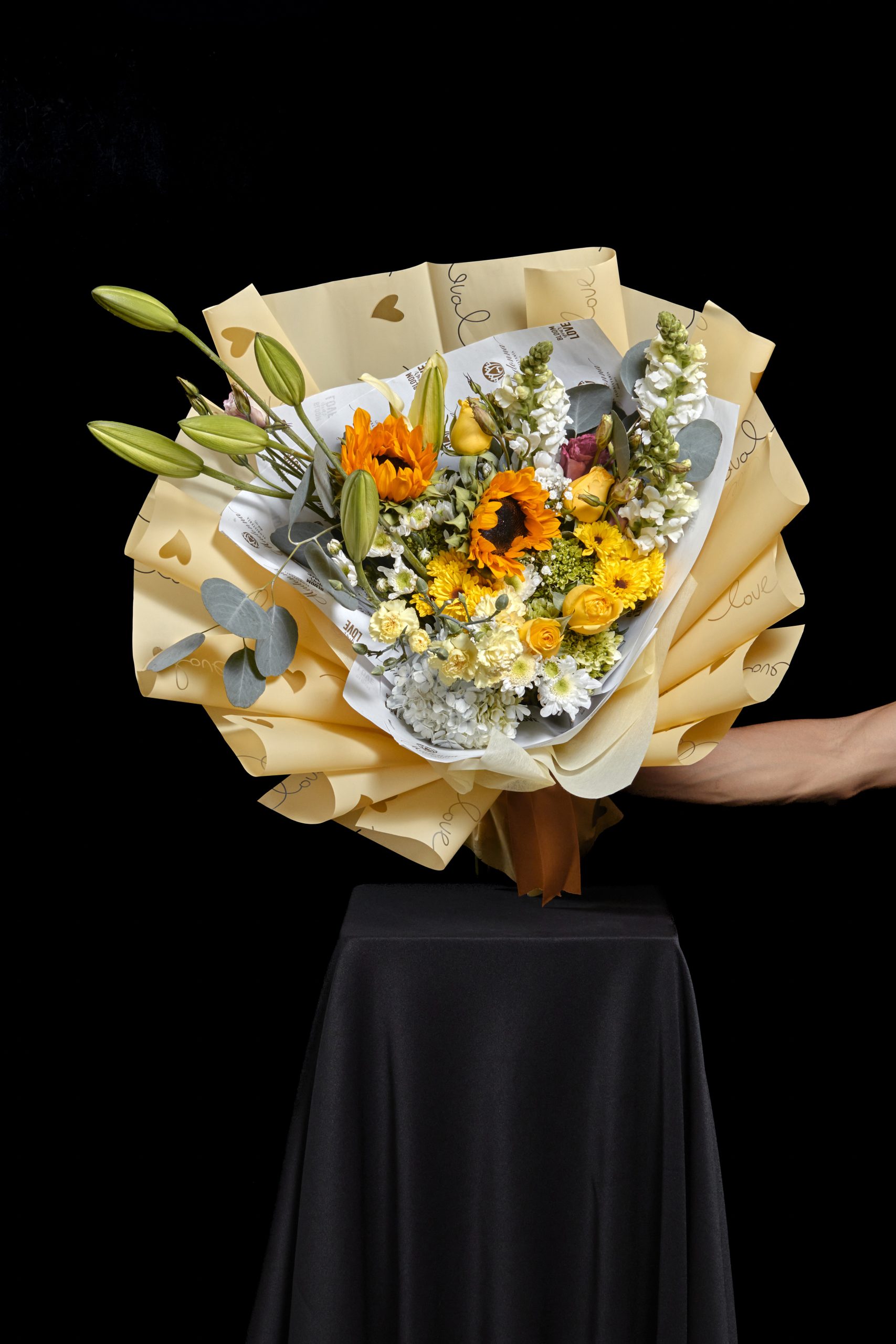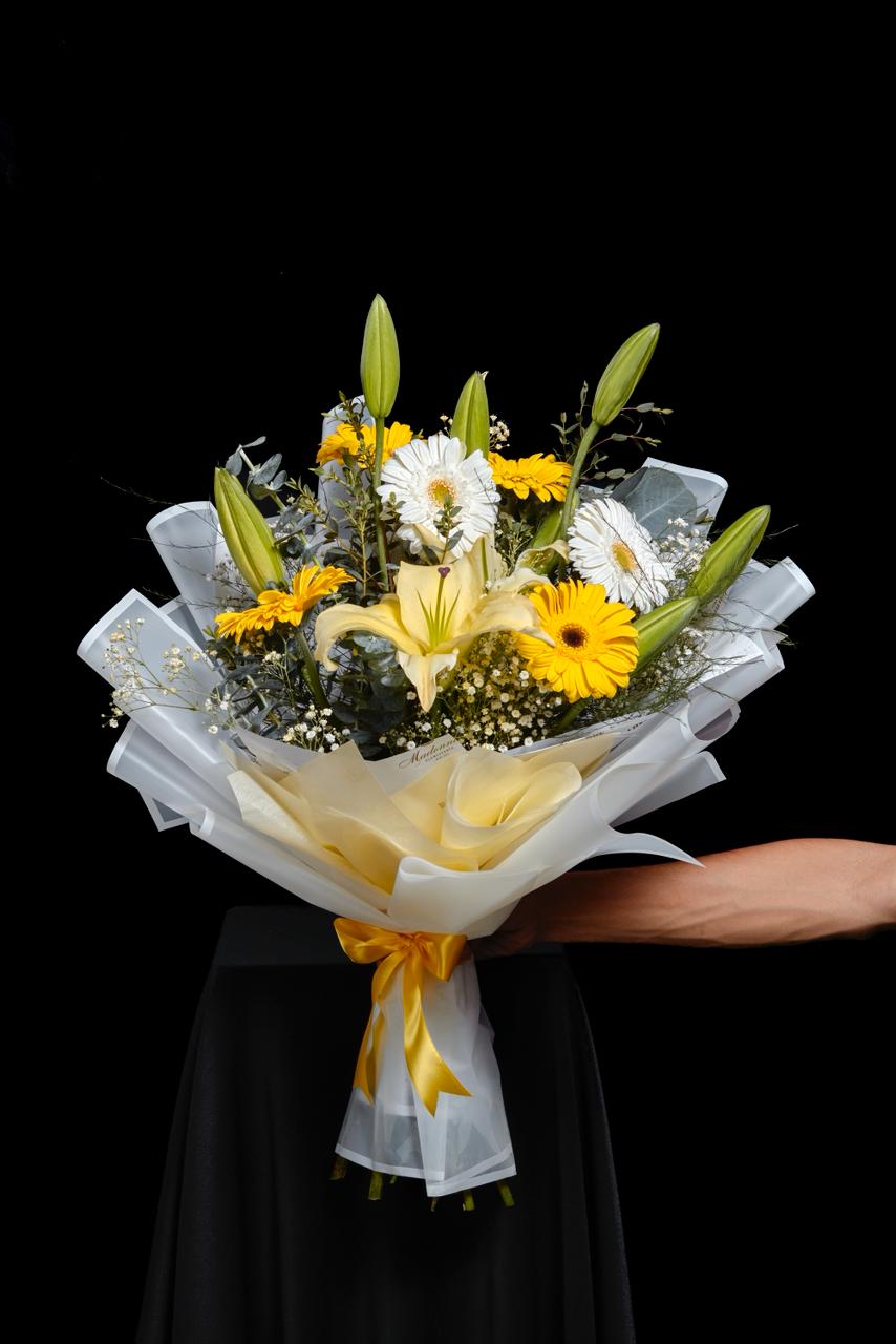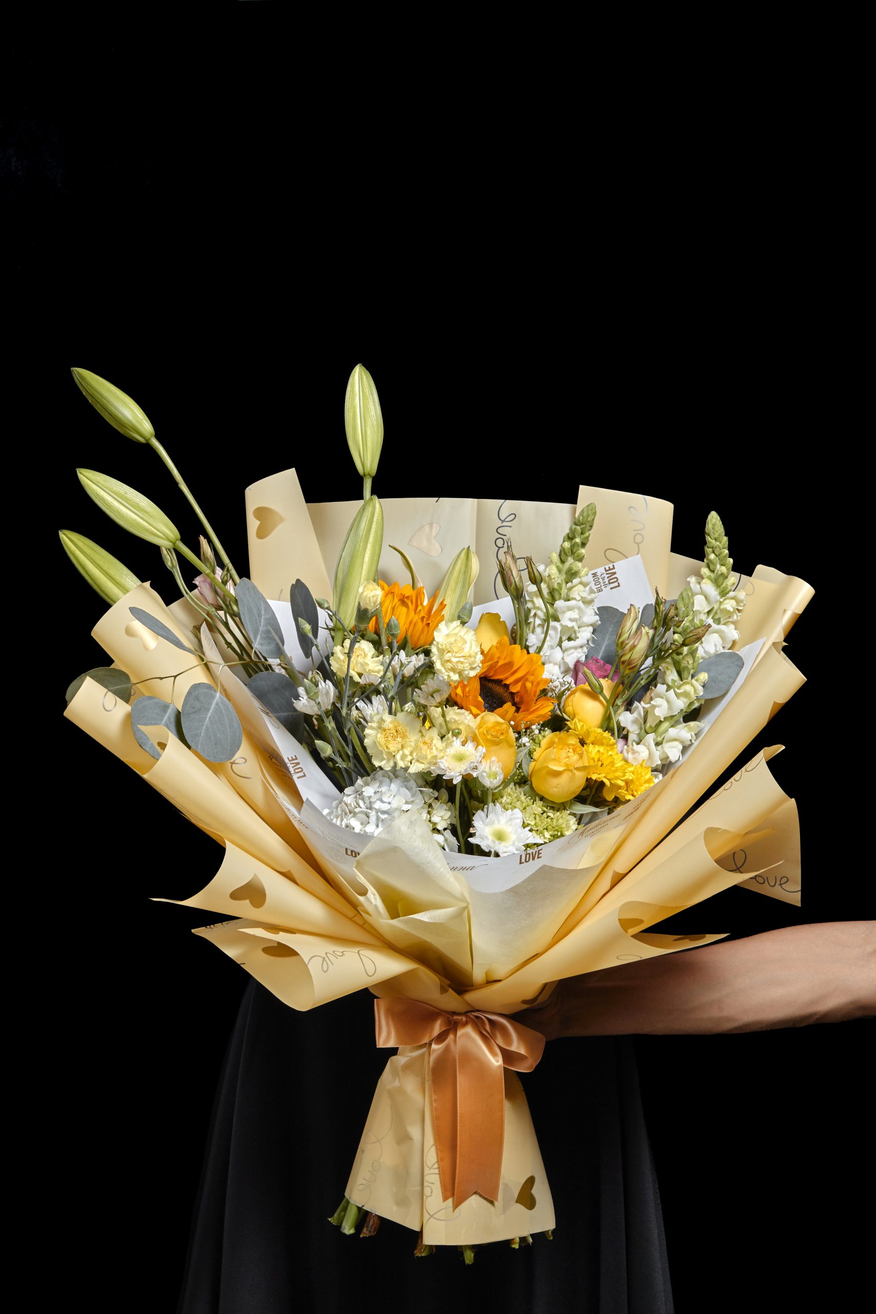 Ramo floral con Girasoles, Rosas, Lilis, Hortencias y Follajes especiales.
