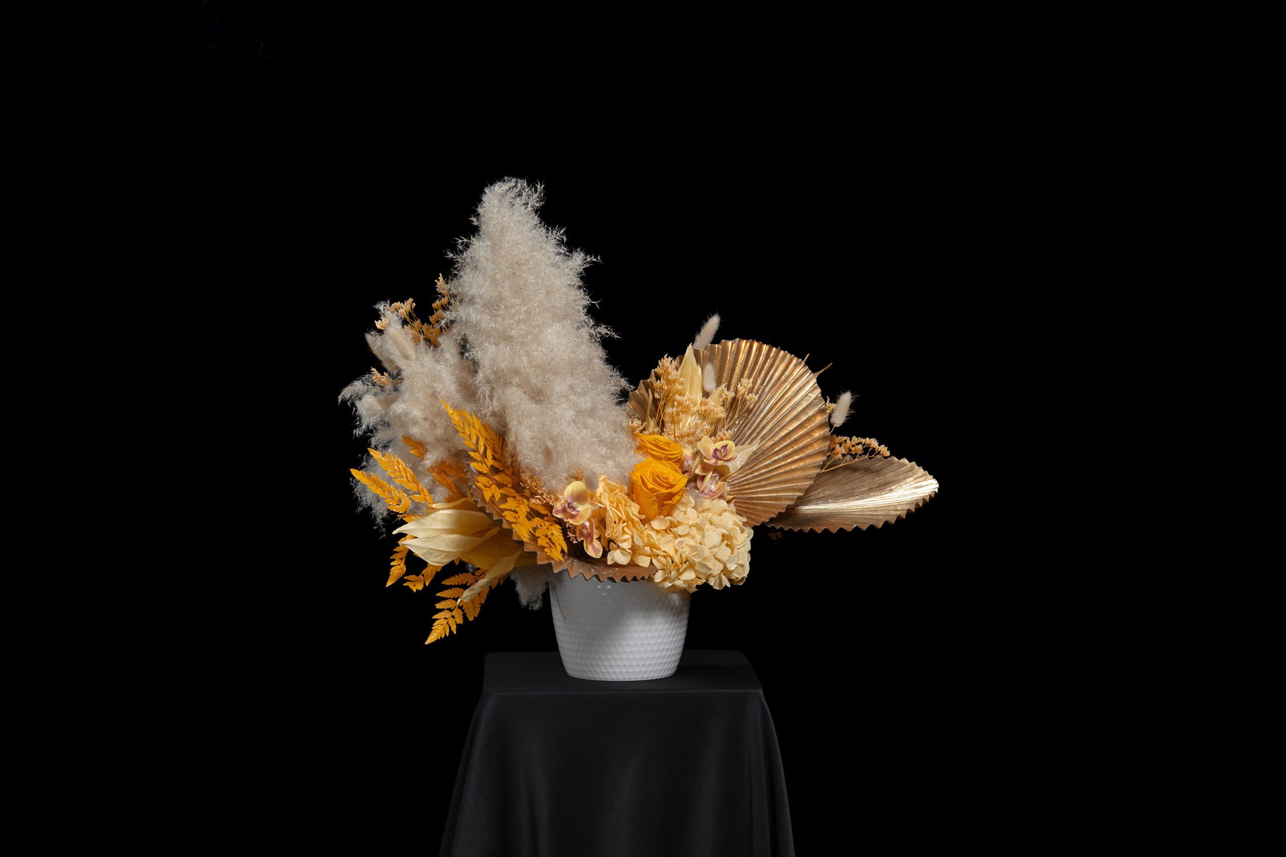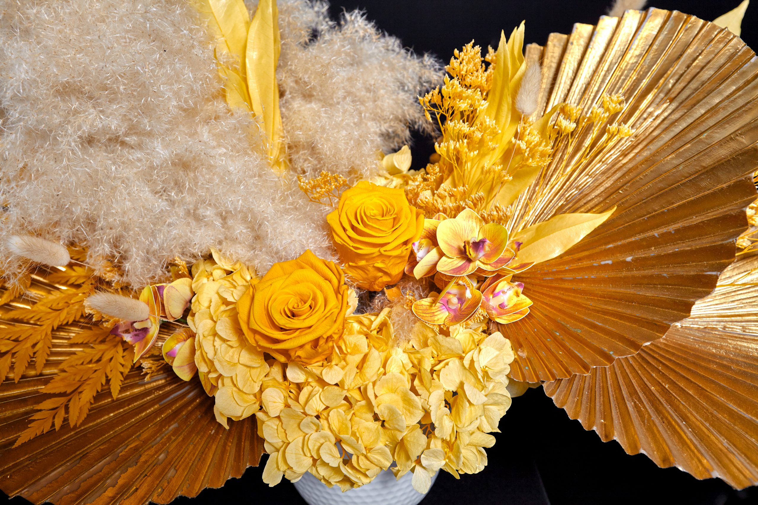 Diseño Floral natural (ETERNO) preservado con Rosas, Hortencias, Pampa, Follajes y Orquídeas Artificiales.