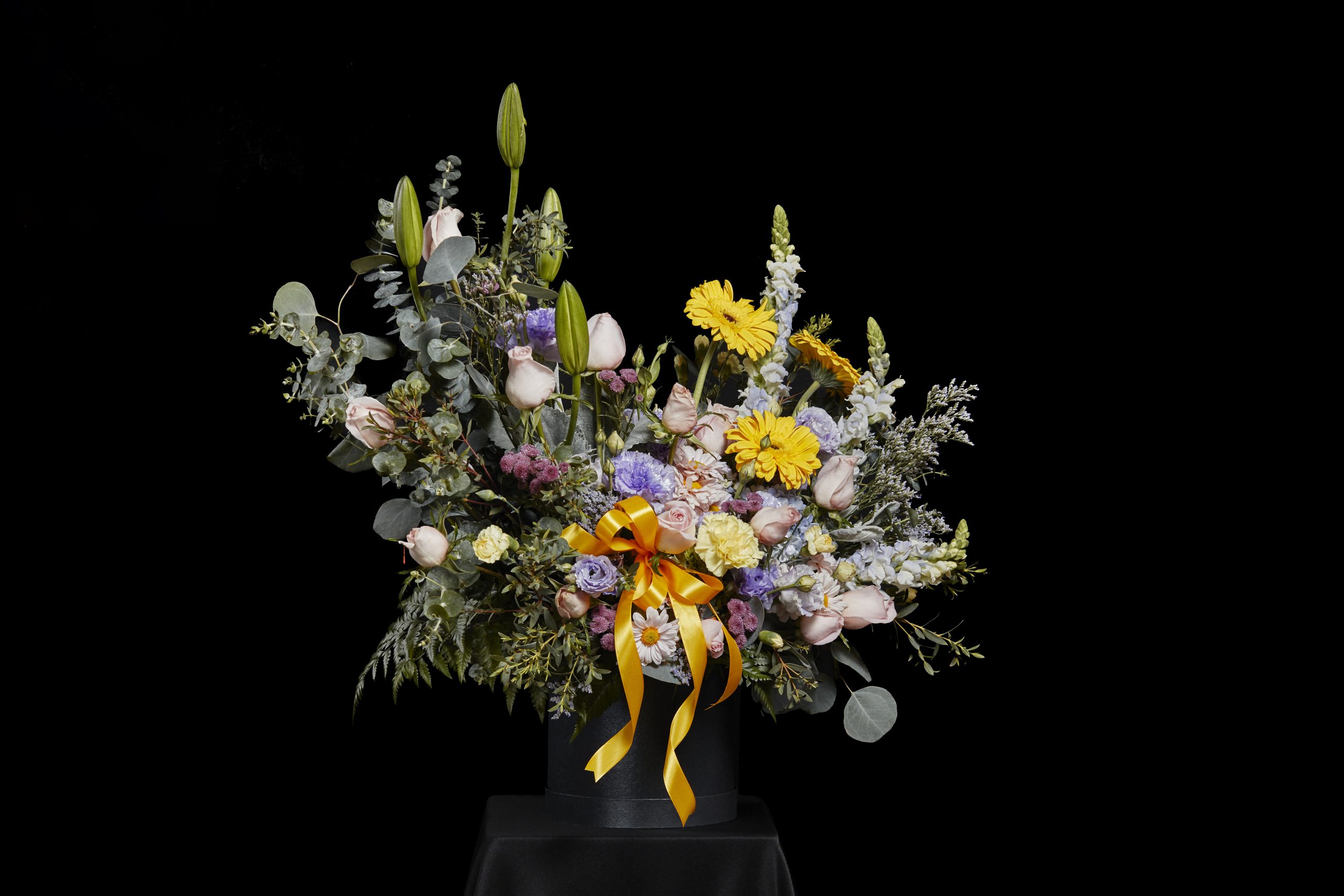 Diseño Floral natural con Gerberas, Rosas, Clavel, Lilis, y Follajes especiales.