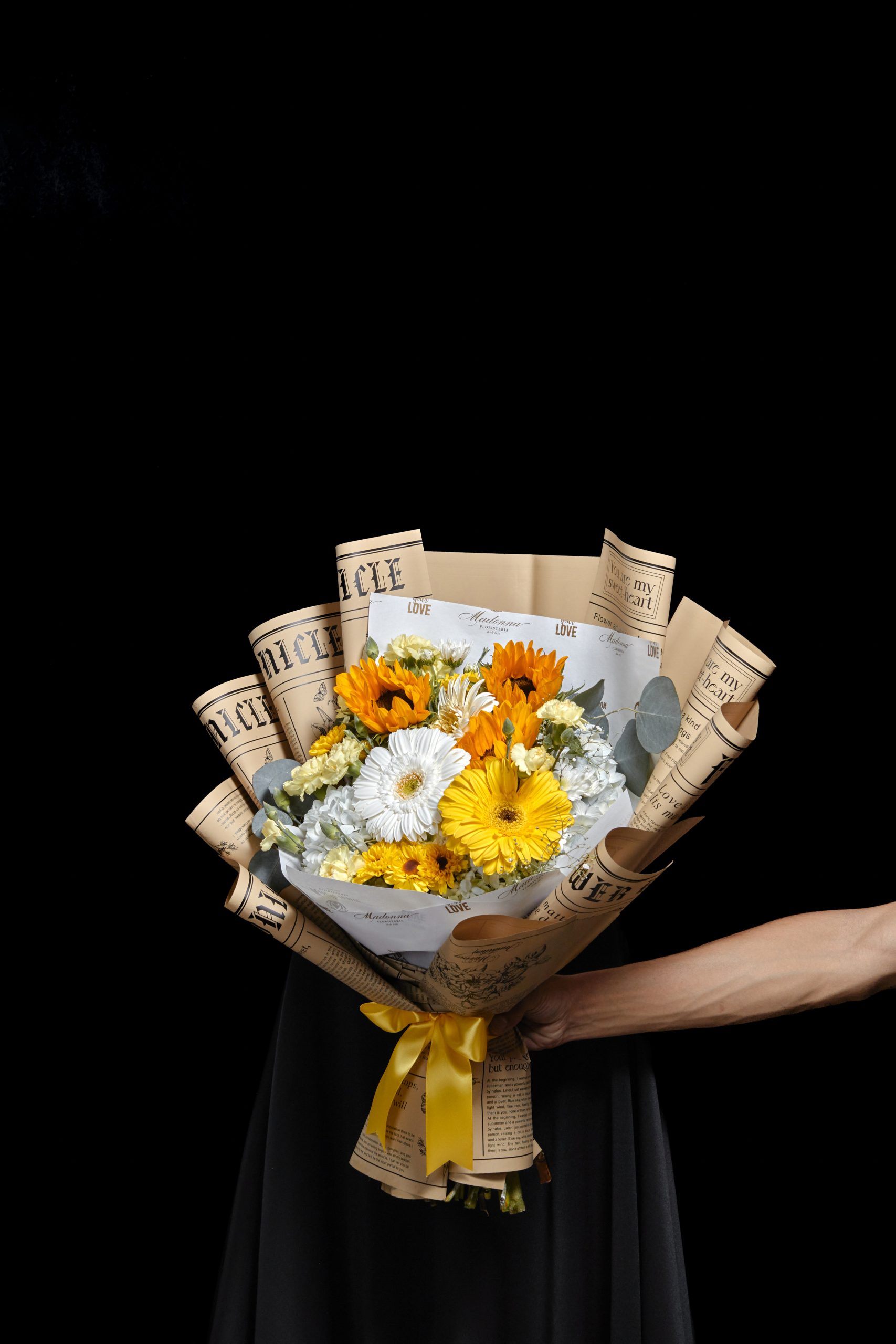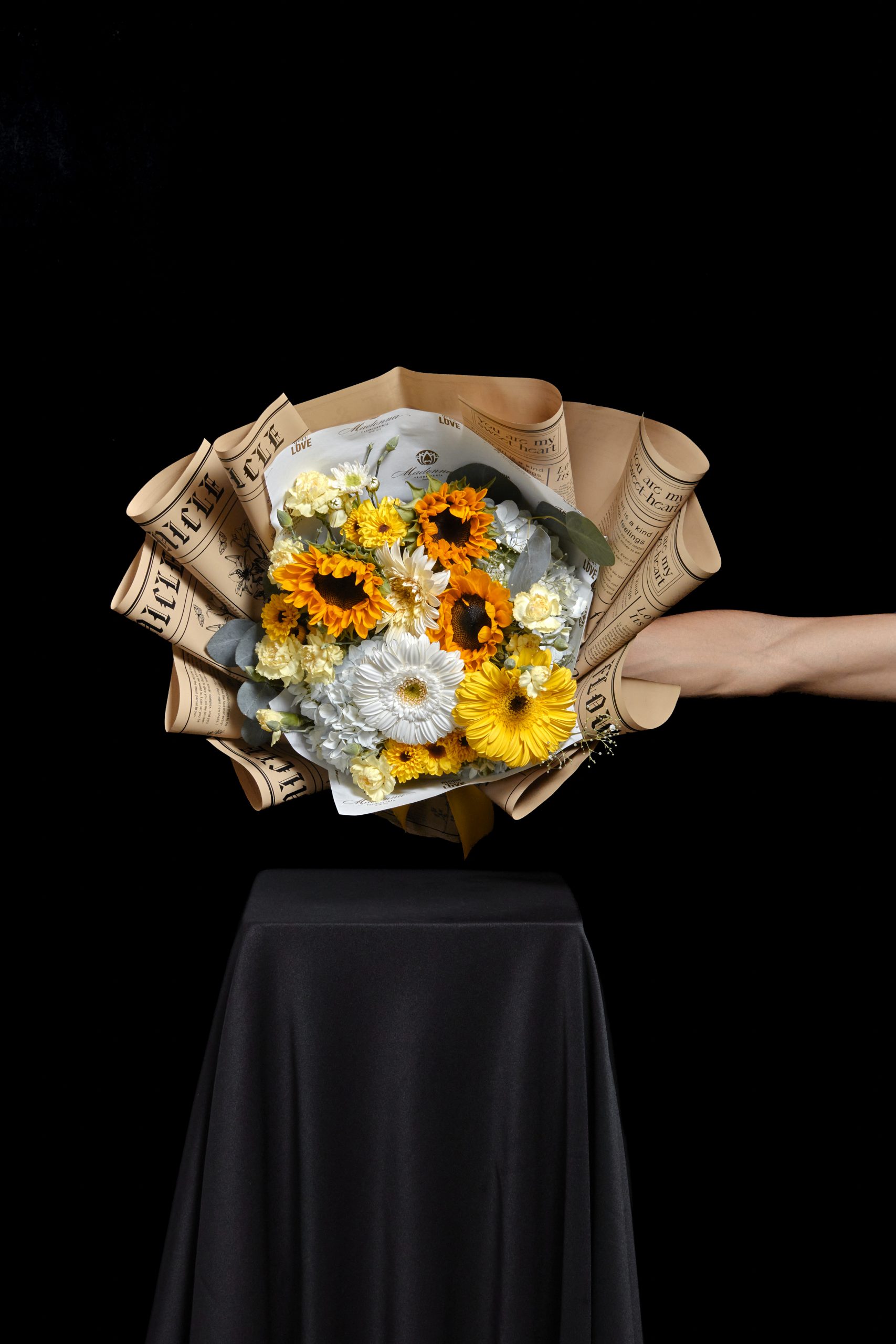 Ramo floral con Gerberas, Girasol, Hortencias y Follajes especiales.