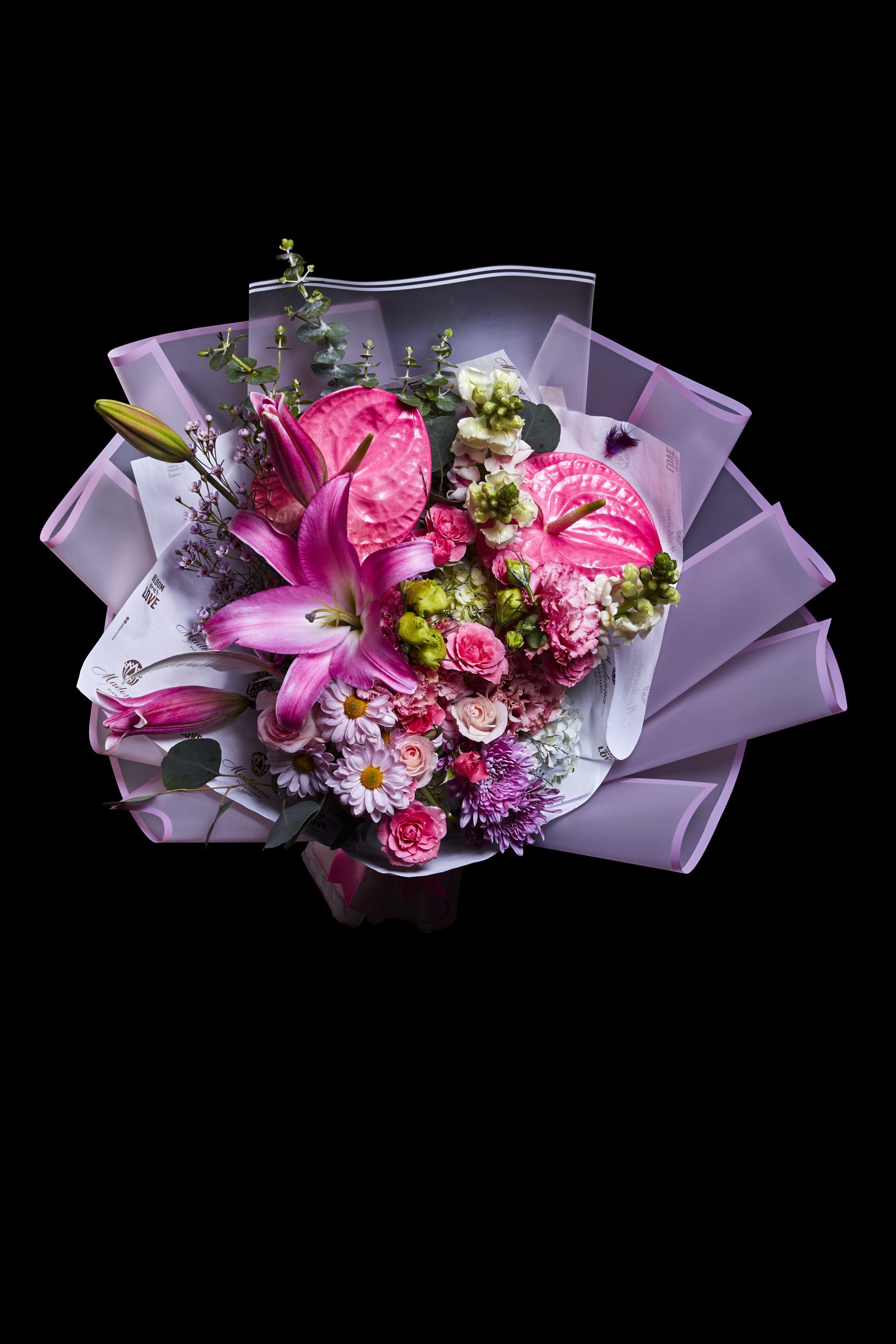 Ramo floral natural con Lilis Oriental, Anturios, Snap Dragon, Margaritas, Mini Rosa, Hortencias, Lisianthus, Mini Dolar, Leather.